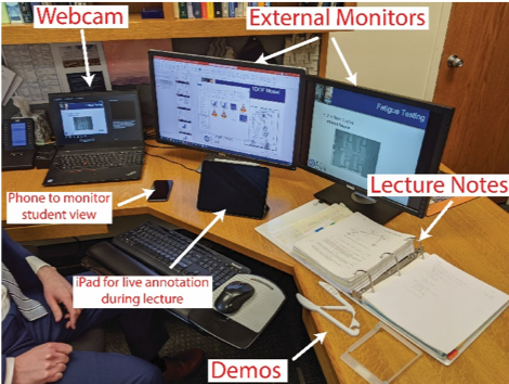 Context: This was my first time teaching an online lecture. It is a graduate course in mechanical engineering (ME 538, Compliant Mechanisms) with 31 students enrolled. The intent was to experiment with several teaching modes, so it included regular lecture, PowerPoint slides, student participation with them sharing video and answering questions, annotations on a PDF, showing video, and writing on a “whiteboard.”